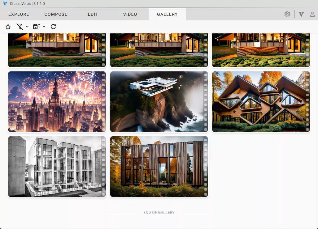 Tryb galerii zapewnia czytelny podgląd wszystkich wizualizacji w jednym, uporządkowanym miejscu. Zamiast przeszukiwać foldery na dysku, widzisz wszystkie swoje prace w formie miniatur w widoku siatki. Ułatwia to porównywanie wersji, powrót do dawnych pomysłów i kontynuowanie wcześniejszych poszukiwań projektowych bez zakłócania płynności pracy.